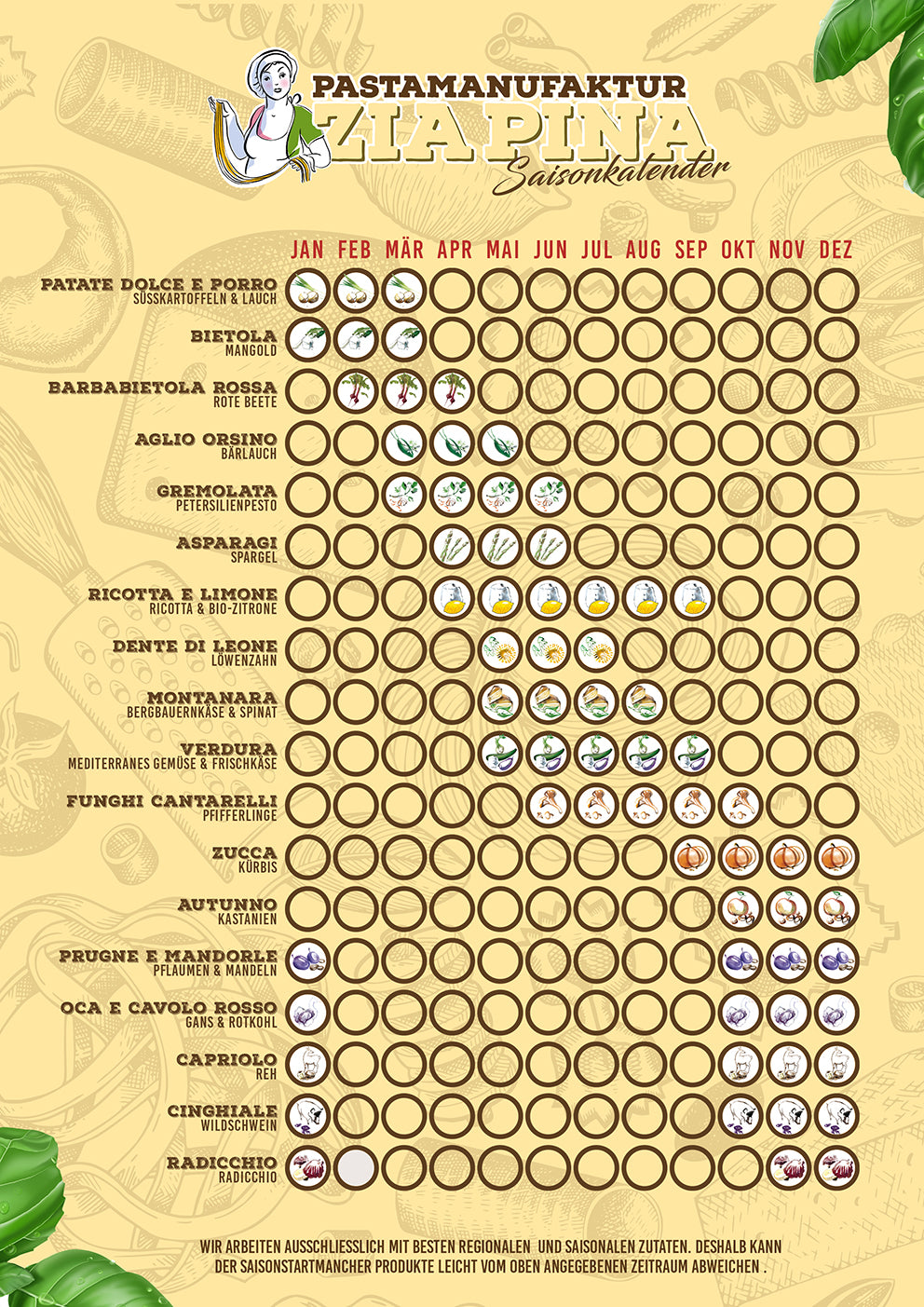Mit dem Saisonkalender behalten Sie den Überblick über unsere saisonalen Pasta-Spezialitäten.