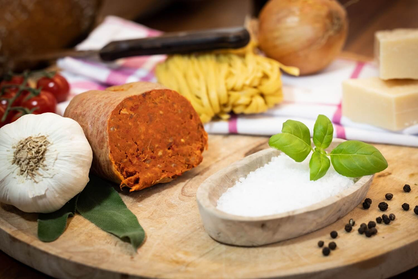 Würzig-scharf und unglaublich lecker: Nduja ist eine pikante Salami aus Kalabrien. Das Besondere: Die Wurst wird nicht wie üblich in Scheiben geschnitten, sondern kann dank ihrer weichen Konsistenz aufs Brot gestrichen werden. Die Rohwurst wird aus bestem Schweinefleisch, Speck und Chilis aus Kalabrien hergestellt. Die Nduja wird leicht geräuchert und reift anschließend lange im Naturdarm. Diese italienische Spezialität schmeckt hervorragend auf einer Scheibe geröstetem Weißbrot. Sie eignet sich aber auch als würzige Basis für eine Pizza oder eine schmackhafte Tomatensoße. Nduja ist ein echter Geheimtipp der italienischen Küche, der jedem Gericht das gewisse Etwas verleiht.