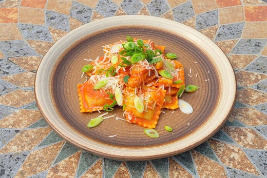 - Die Agnolotti mit etwas Kochwasser in die Sauce geben und durchschwenken. Anschließend auf einem vorgewärmten Teller anrichten und mit geschnittenen Frühlingszwiebeln und geriebenem Hartkäse bestreuen.