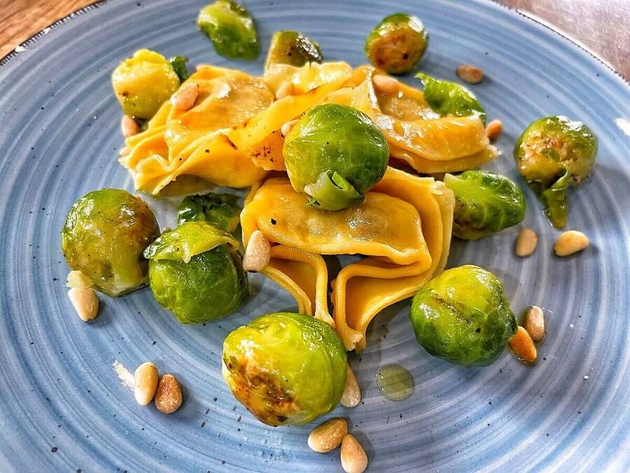Feine Pasta trifft auf herzhaftes Fleisch: Diese hausgemachten Tortellacci sind großzügig gefüllt mit nach römischer Art zubereitetem Spanferkel – langsam geschmort, mit frischem Rosmarin verfeinert und besonders zart. Der dünne, goldgelbe Pastateig umhüllt die würzige Füllung und sorgt für ein harmonisches Zusammenspiel aus feinen Röstaromen und weicher Textur. Ein Genuss für alle, die gefüllte Pasta lieben und Wert auf ein besonderes Genusserlebnis legen.
